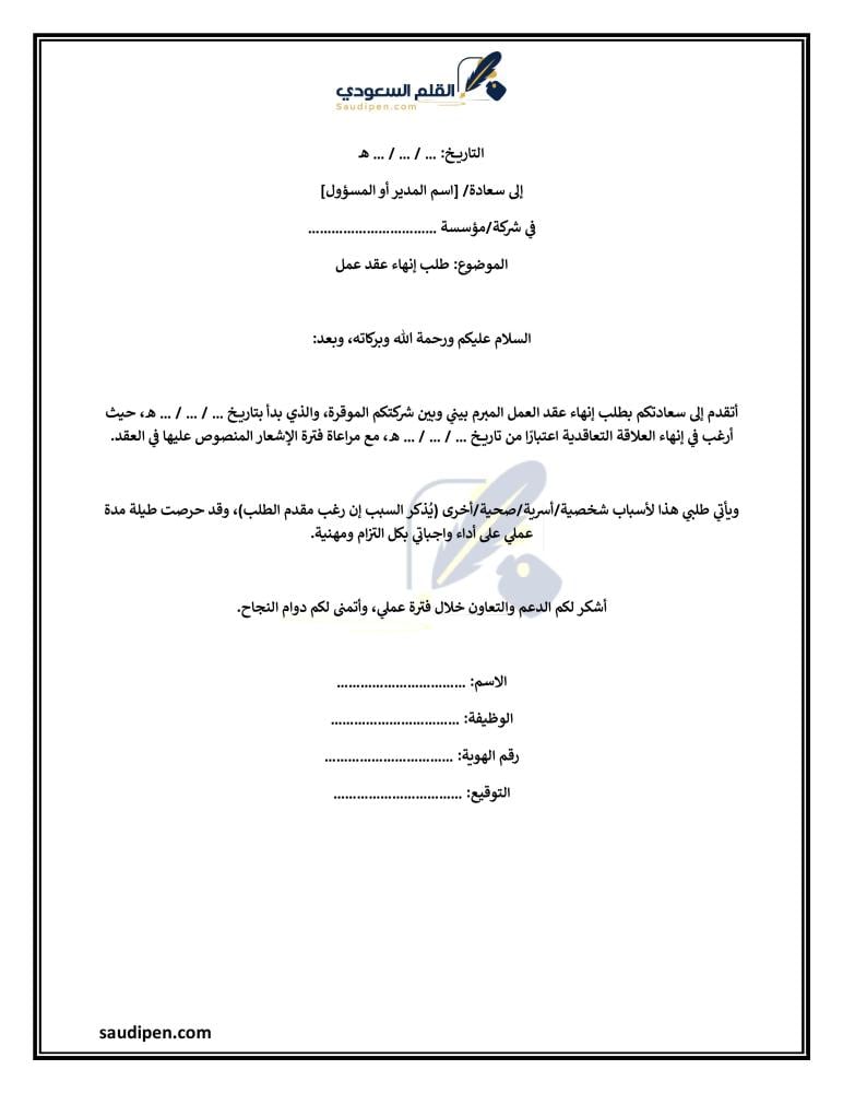 أود أن أحيطكم علمًا بأنني قررت إنهاء عقد العمل المبرم بيني وبين [اسم الشركة] والذي بدأ في تاريخ [تاريخ التعاقد]، وذلك بناءً على [اختياري: رغبتي الشخصية في إنهاء العمل، أو لأسباب شخصية/صحية/مهنية].
