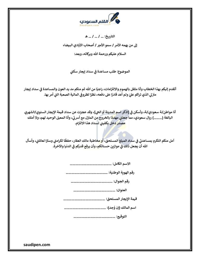 أرفع إلى مقامكم الكريم هذا الخطاب راجيًا من الله ثم منكم النظر في وضعي المالي الصعب، حيث إني أحد المواطنين المستأجرين لعقار سكني يقع في ……….……………… [العنوان الكامل]، وقد تراكمت عليّ مبالغ الإيجار بسبب ظروف معيشية قاهرة، منها ……………………………………. [توضيح السبب، مثل: (فقدان وظيفة، ظروف صحية، وفاة عائل الأسرة، إلخ)].