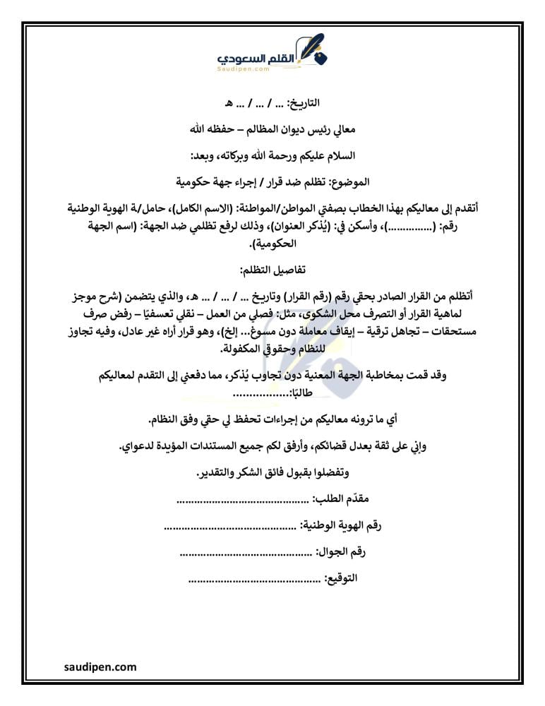 يمكن الاستعانة بالنموذج التالي لصيغة التظلم لديوان المظالم:
