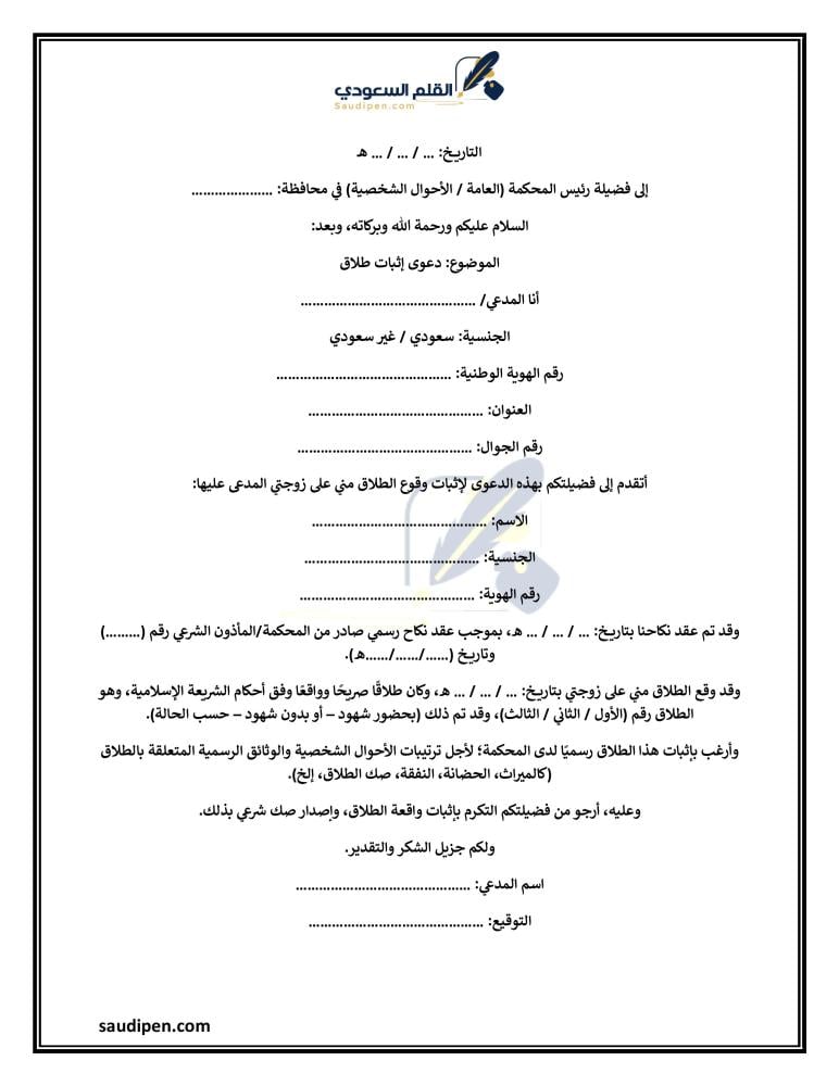 وقد تم الطلاق في [مكان وقوع الطلاق] ولم يتم توثيقه في المحكمة الشرعية حتى الآن. وبناءً عليه، أطلب من المحكمة الموقرة إثبات الطلاق وتوثيقه في سجلات المحكمة لتسجيله رسميًا.
