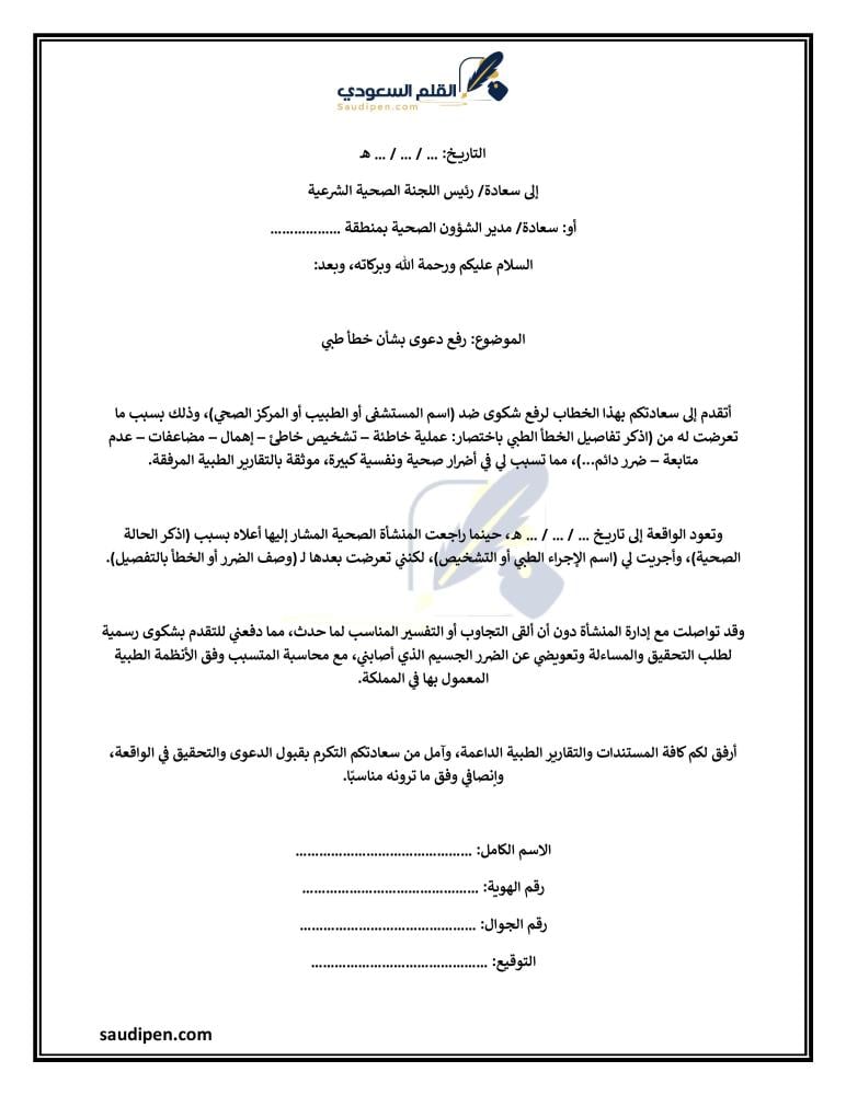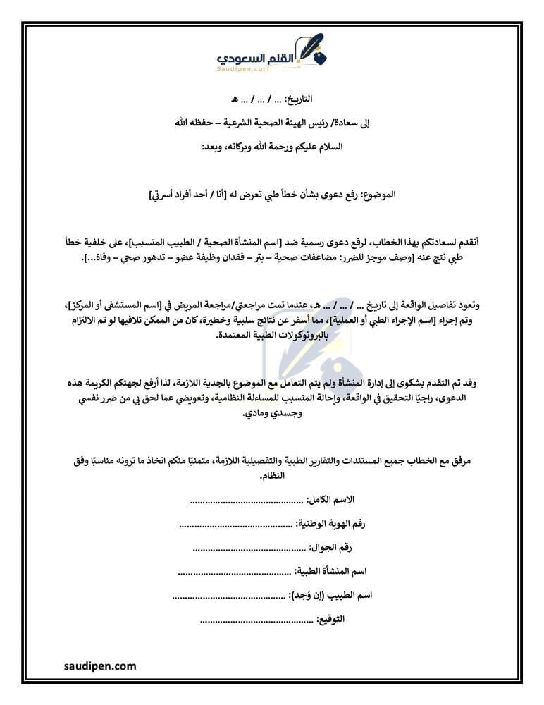 قبل التوجه للمحكمة يجب تقديم شكوى رسمية إلى الهيئة الصحية الشرعية، وهي الجهة المختصة بالنظر في الشكاوى ضد الممارسين الصحيين.