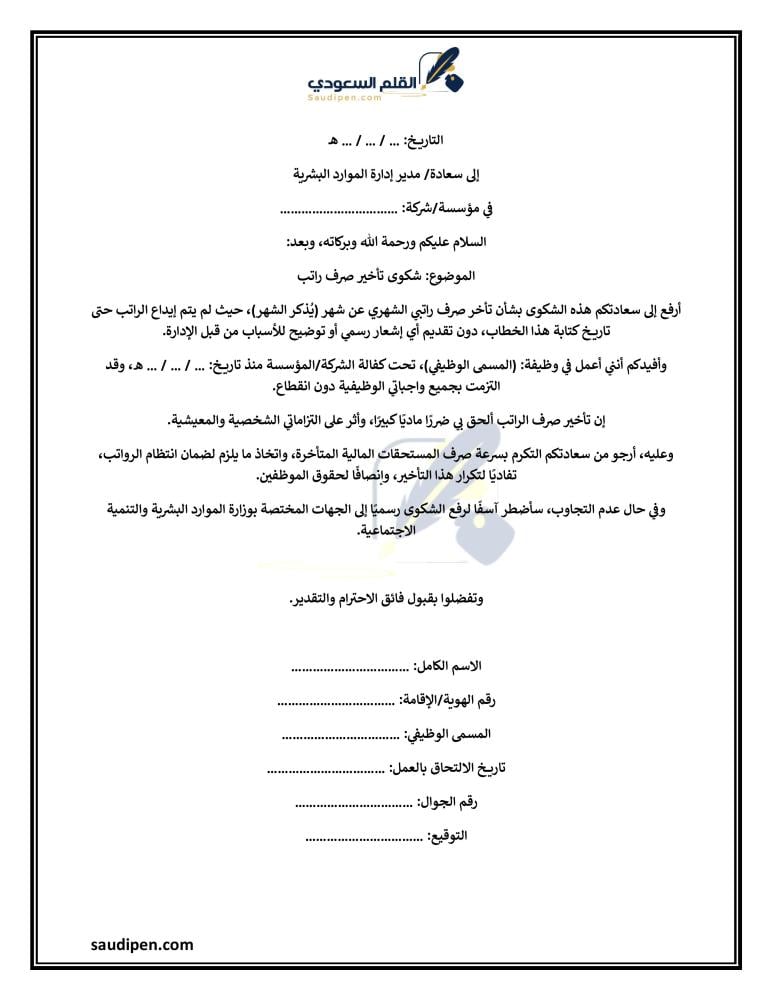 إليك صيغة شكوى تأخير الراتب التي يمكنك استخدامها لتقديم شكواك بشكل رسمي إلى وزارة الموارد البشرية والتنمية الاجتماعية أو مكتب العمل: