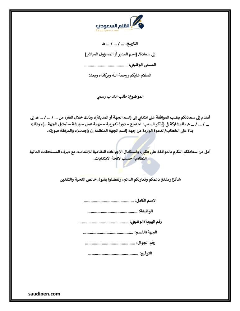 يمكنك الحصول على نموذج طلب انتداب احترافي جاهز من خلال موقعنا القلم السعودي المتخصص في كتابة الخطابات الرسمية، حيث نوفر لك نماذج دقيقة وقابلة للتعديل تناسب جميع أنواع الانتدابات، سواء كان داخليًا، خارجيًا، مؤقتًا أو دائمًا.