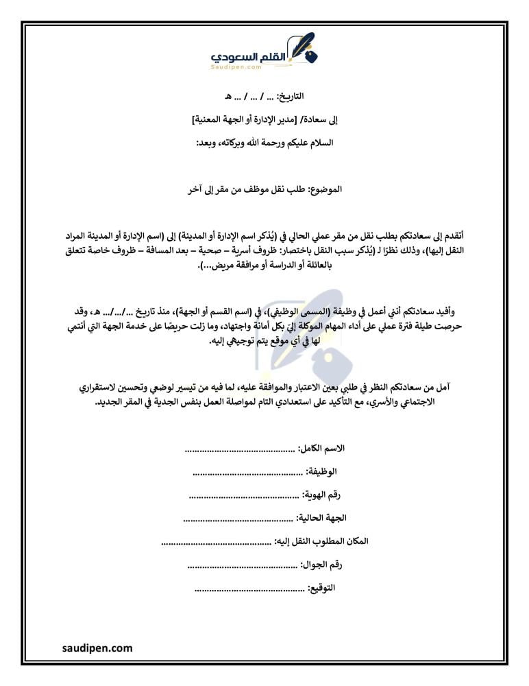 السيد القائد أتقدم لكم بطلب نقلي كموظف عسكري، وأتمنى أن ينال موافقتكم لنقلي إلى …………………………………….، حيث أنني بهذا المعسكر منذ ………………….، وأود النقل من …………………. إلى ……………، إلى المنطقة التي أعيش فيها مع عائلتي؛ وذلك لأنني: ……………………………………………………………………………