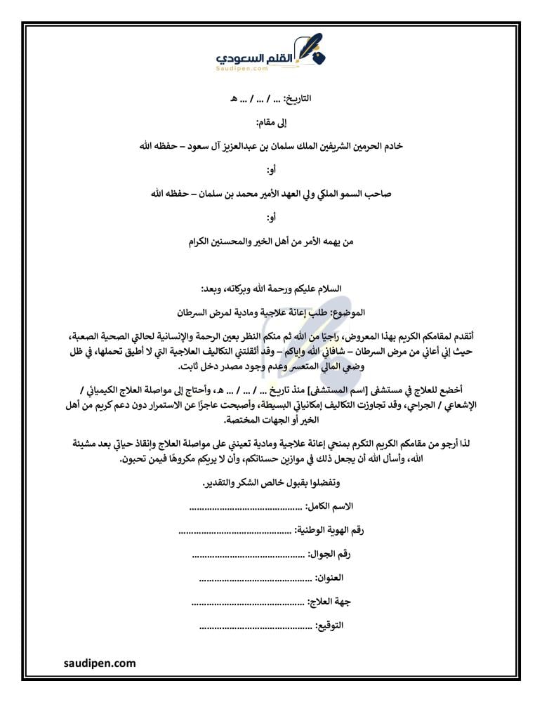 أنا المواطن/المواطنة: [اسم المريض]، رقم الهوية الوطنية: [رقم الهوية]، أرفع إلى مقامكم الكريم هذا المعروض، طالبًا من الله ثم منكم المساعدة في تحمل تكاليف علاج مرض السرطان الذي أصبت به.