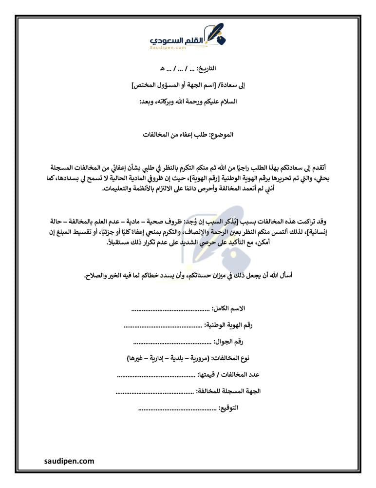 أنا المواطن …………………….. أحمل بطاقة هوية رقم ….………….. أمتلك سيارة للأجرة ورقم لوحتها …………..، فقد تراكمت عليَّ المخالفات المرورية التي اقترفتها خلال قيادتي، ولا أستطع سدادها، وذلك بسبب ظروفي المادية الصعبة، وما أمر به في هذه الأيام من أزمة مالية شديدة، فإنني لا أستطيع توفير المتطلبات الأساسية والضرورية من طعام وشراب وملابس لأسرتي، وبالكاد يكفي ما أجلبه من مال لإيجار الشقة، وتوفير تكاليف الحياة الأساسية.