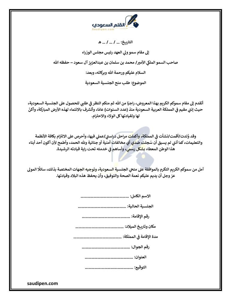 أتقدم إلى سموكم الموقر أنا ……………………………….. بطلبي هذا لمنحي الجنسية العربية السعودية.
