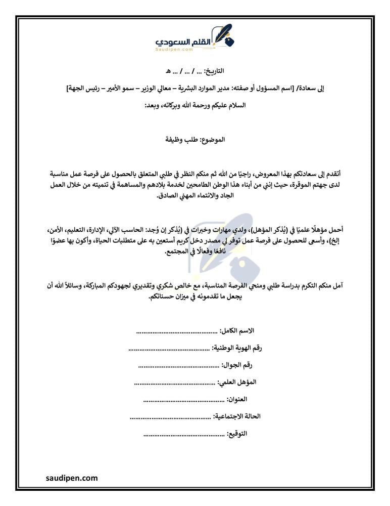 او للديوان الملكي، الذي يجب صياغته بشكل رسمي ومميز؛ حتى يتبين للمسؤولين جدية طالب العمل و أحقيته بالحصول عليه.
