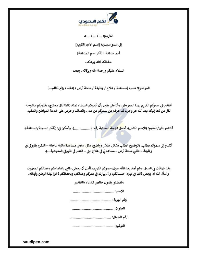 يمكن ارسال صيغة معروض طلب وظيفة للامير كما هو موضح بالنموذج التالي: