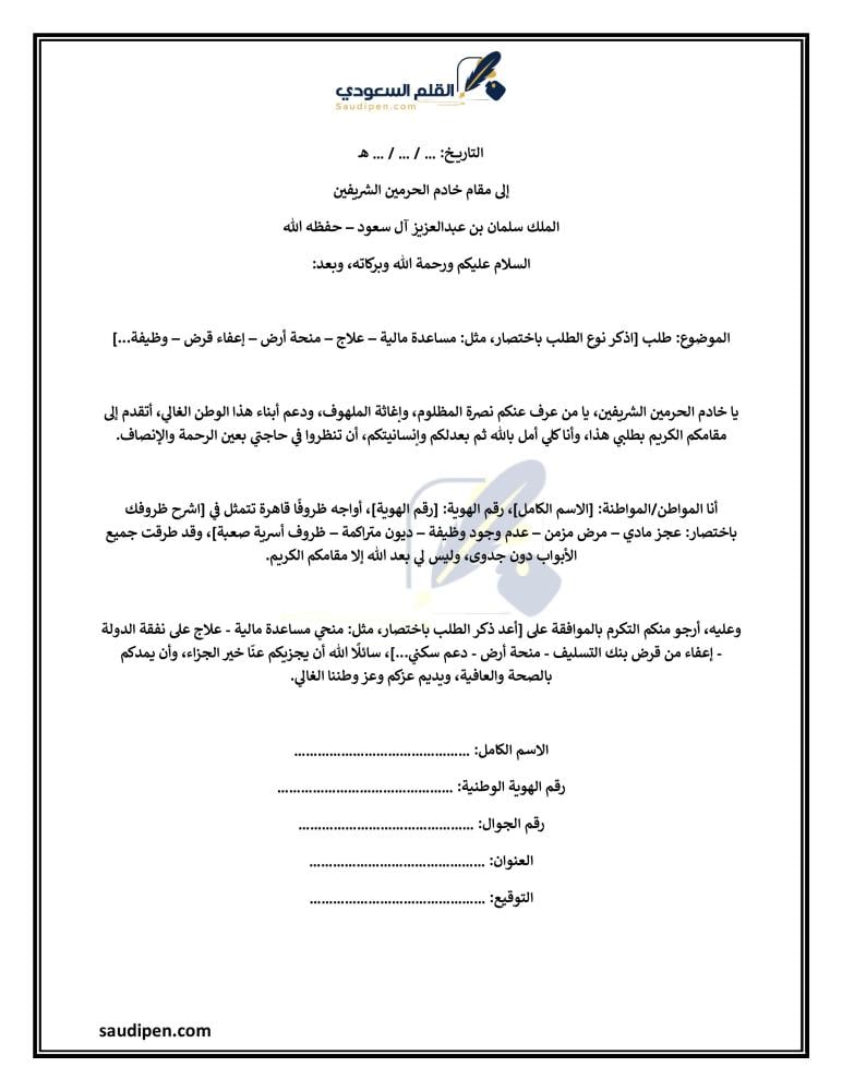 قد يتعرض البعض إلى الإصابة بمرض يجعله غير قادر على ممارسة مهام عمله، وبذلك يضطر على ارسال خطاب للملك سلمان، من أجل طلب المساعدة للعلاج، في حين يمكن الاستعانة بالصيغة التالية: