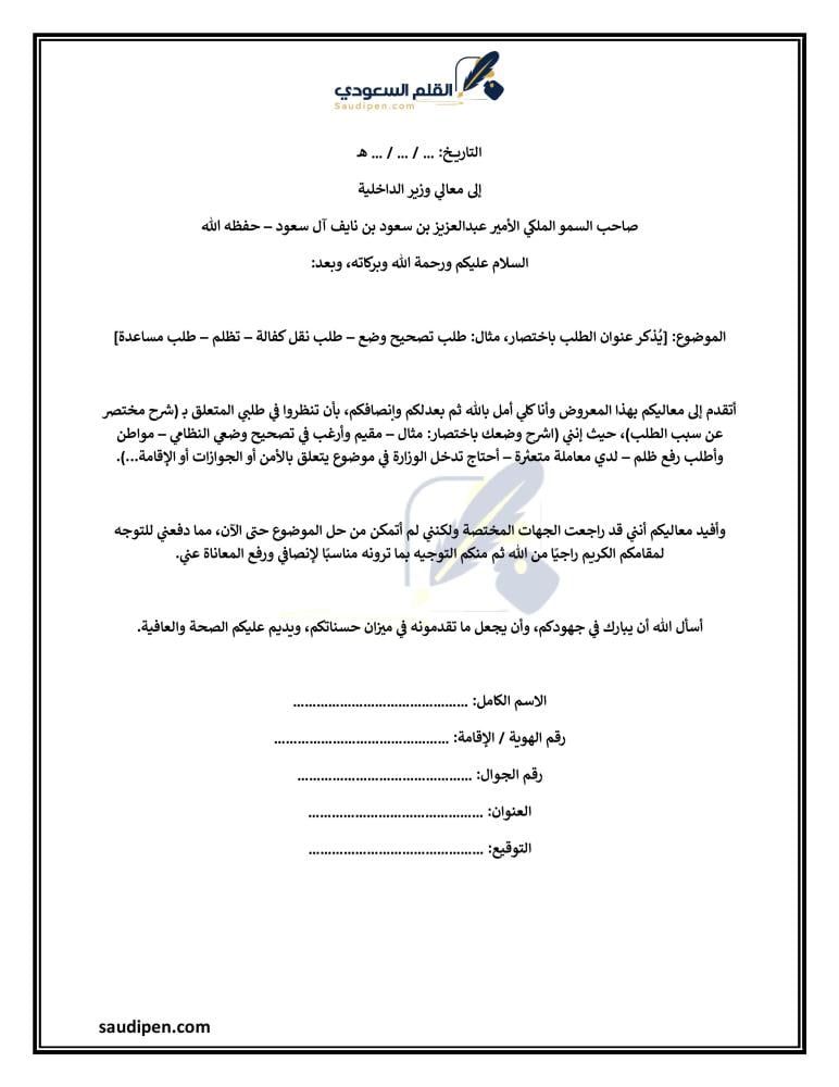 يمكن كتابة خطاب رسمي لسيادة وزير الداخلية بالمملكة العربية السعودية باتباع الخطوات التالية: