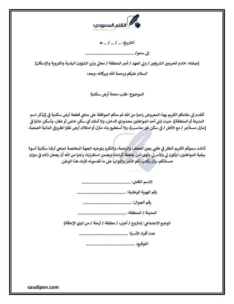 أتقدم إلى سيادتكم بهذا الطلب متمنيًا من الله ثم من شخصكم الموقر النظر في طلبي لمنحي قطعة أرض سكنية في مدينة: ……….